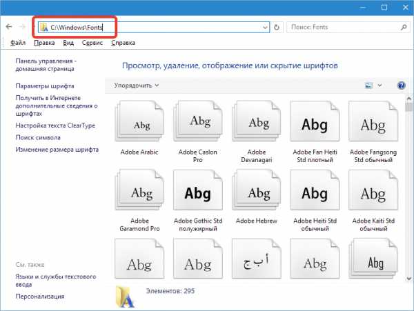 Открываем библиотеку шрифтов. Она находится в папке Windows — Fonts. Обычно адресная строка имеет такой вид: C:\Windows\Fonts.