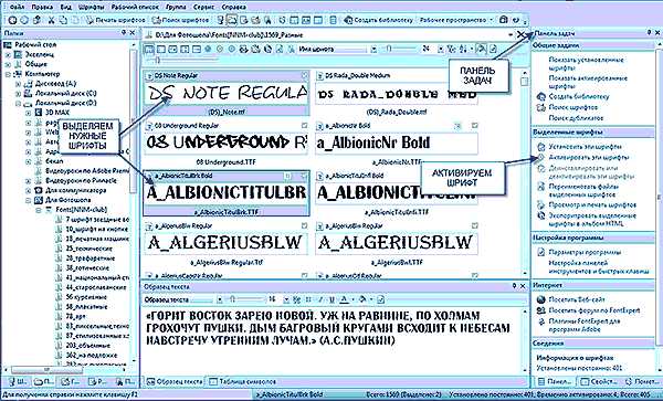 Шрифты можно помещать в наборы (группы), и затем устанавливать или деактивировать целые наборы шрифтов. Группа шрифтов является обычной папкой на диске и может содержать как сам шрифт, так и ярлык, который ссылается на шрифт, находящийся в другой папке локальном диске компьютера или сетевом устройстве. Добавлять шрифты или ссылки на шрифты в окно с группами шрифтов можно путем перетаскивания из других окон программы или из Проводника Windows Explorer.