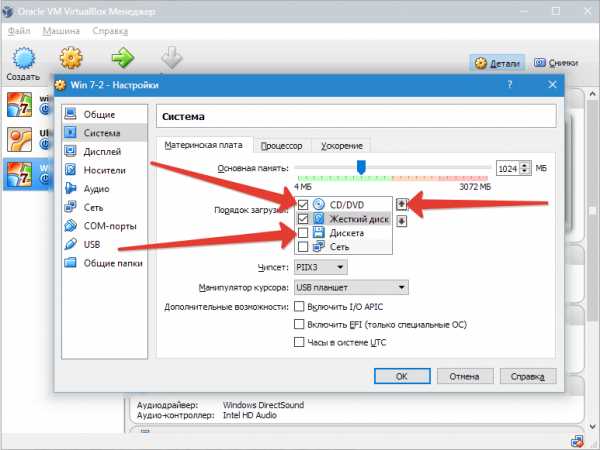 2. Определим очередность загрузки. Проигрыватель флоппи-дисков (дискет) не нужен, отключаем его. 1-м в списке следует назначить CD/DVD-привод для того, чтобы иметь возможность устанавливать ОС с диска. Отметим, что это может быть как физический диск, так и виртуальный образ.