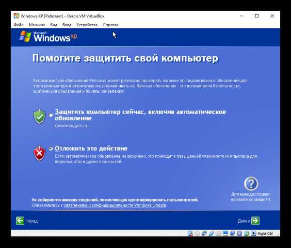 Далее следует окно Центра обновлений. Для виртуальной машины лучше выбрать третий пункт.