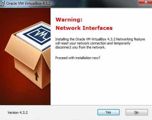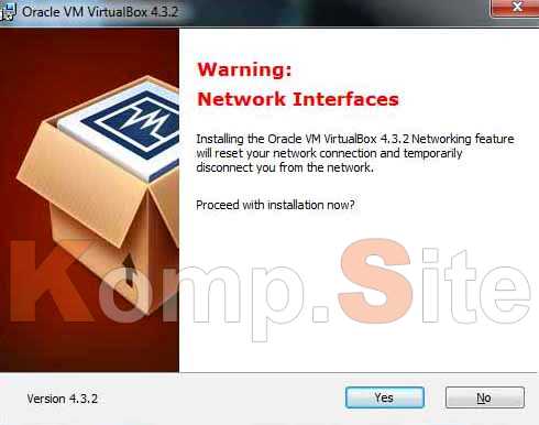 - Важный момент — в процессе установки Virtualbox ПК на время отсоединится от Интернета. Так что если в это время вы параллельно что-то скачиваете (настоятельно этого делать не советую – система зависает), то вначале дождитесь завершения процесса, а только потом нажимайте Yes.