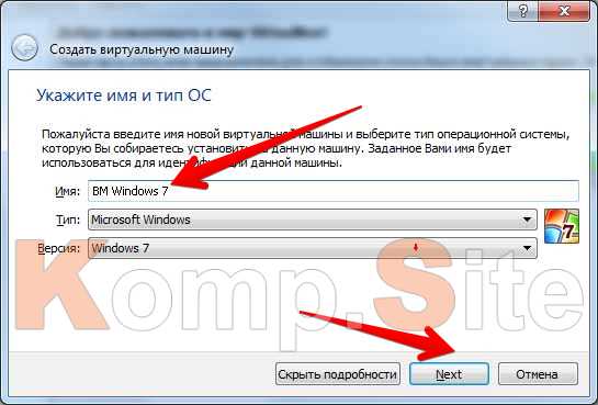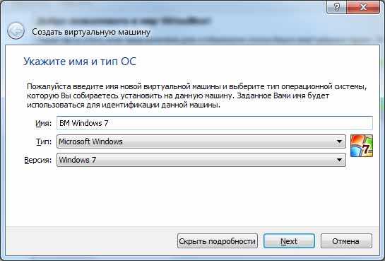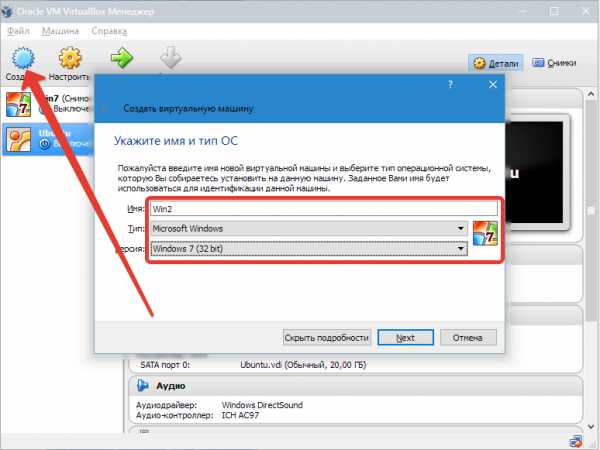 - Необходимо будет нажать в главном окне Virtualbox кнопку Создать, затем указать название машины и параметры операционной системы – из выпадающих списков указываем Microsoft Windows иWindows 7.