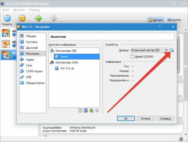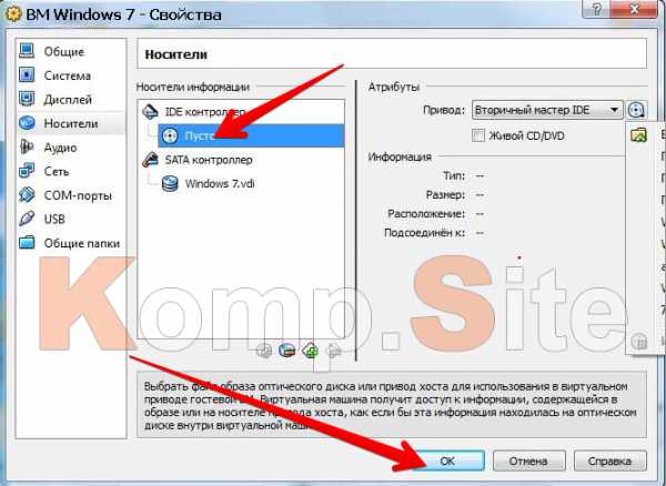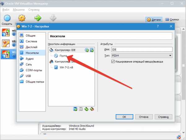 В разделе «Носители» отображается все диски новой виртуалки. Также здесь можно увидеть виртуальный привод с надписью «Пусто». В него мы смонтируем образ установочного диска Windows 7.