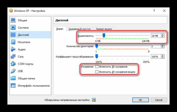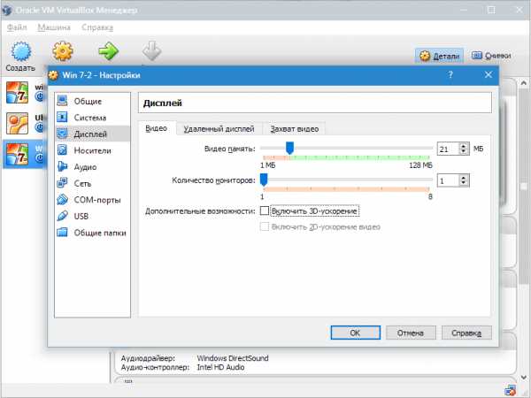 Теперь рассмотрим раздел «Дисплей». На закладке «Видео» указывается объем памяти виртуальной видеокарты. Также здесь доступна активация двухмерного и трехмерного ускорения. Первое из них желательно включить, а второй параметр не является обязательным.