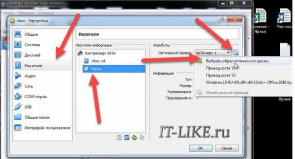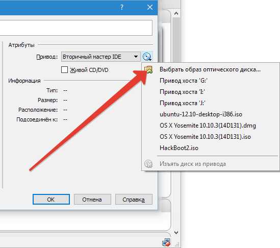 Настраивается виртуальный привод следующим образом: кликаем по значку, расположенному справа. Открывается меню, в котором мы жмем «Выбрать образ оптического диска». Далее следует добавить образ загрузочного диска операционной системы.