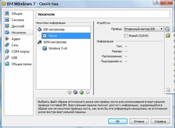 - В принципе, Виндоус можно инсталлировать с дистрибутива CD/DVD или с iso-образа. Что самое интересное, загрузка Windows 7 c iso-образа происходит в разы быстрее. Выбираем раздел Носители, в котором имеется только предварительно сделанный виртуальный жесткий диск и занимаемся настройками (предусмотрено несколько вариантов).