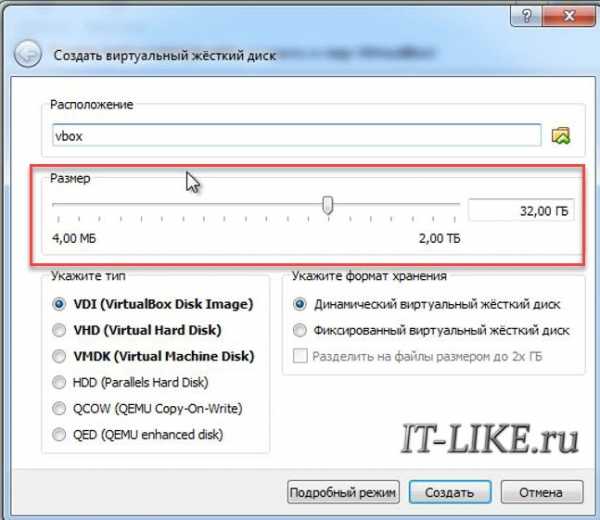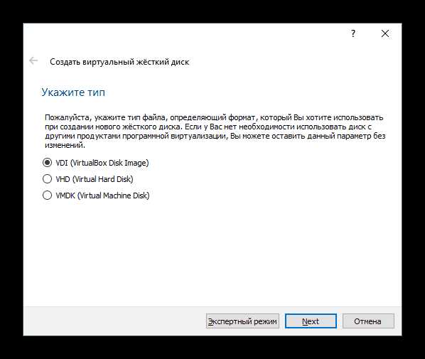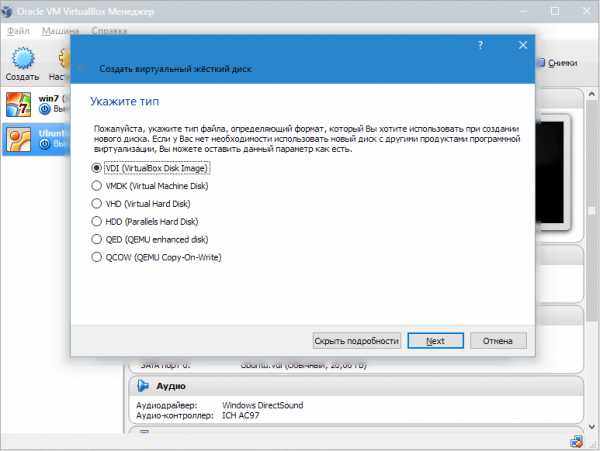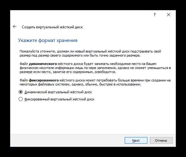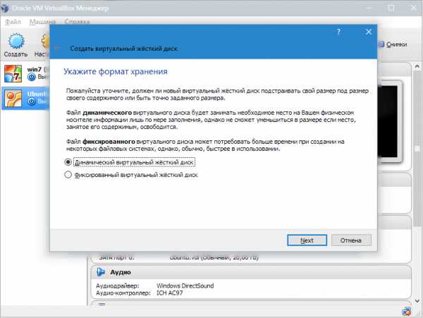 Далее мы указываем тип диска. Он может быть либо динамически расширяющимся, либо с фиксированным размером.