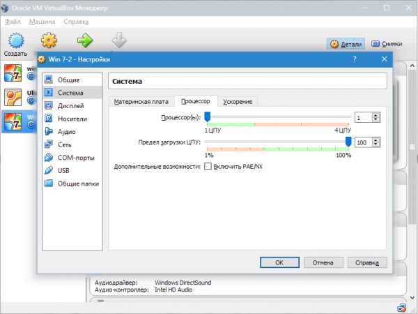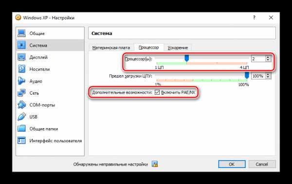 - Переключитесь на вкладку «Система» и увеличьте параметр «Процессор(ы)» с 1 до 2. Для улучшенной их работы задействуйте режим работы PAE/NX, поставьте напротив него галочку.
