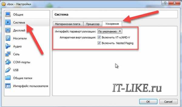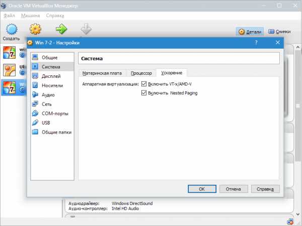 Называются технологии Intel VT-x и VT-d (в дорогих процессорах) и AMD-V. Смысл её заключается в том, что команды подаются напрямую на процессор, минуя драйверы операционной системы. Включается аппаратная виртуализация в настройках ВМ на вкладке «»