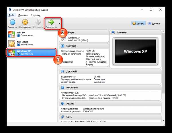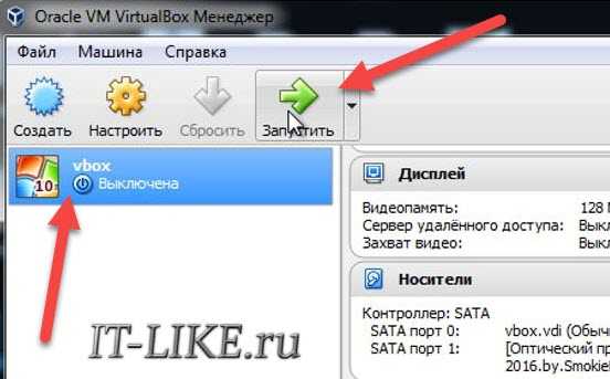 - В левой части VirtualBox Менеджера выделите созданную виртуальную машину и нажмите на кнопку «Запустить».