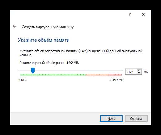 - Выберите, сколько RAM вы хотите выделить под устанавливаемую ОС. VirtualBox рекомендует использовать минимум 192 МБ оперативной памяти, но если есть возможность, то используйте 512 или 1024 МБ. Так система не будет тормозить даже при высоком уровне загруженности.