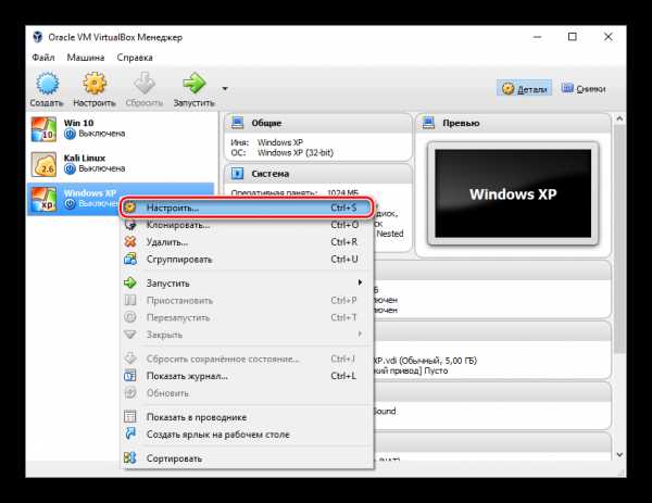 - В левой части VirtualBox Менеджера вы увидите созданную виртуальную машину для Windows XP. Нажмите по ней правой кнопкой мыши и выберите пункт «Настроить».