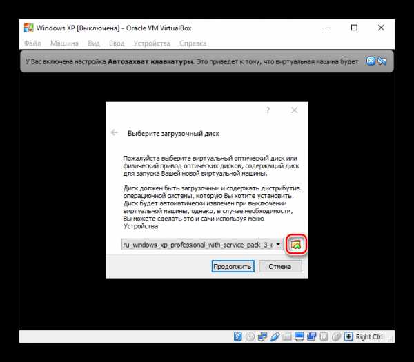 - Вам будет предложено выбрать загрузочный диск для запуска. Нажмите на кнопку с папкой и выберите место, где расположен файл с образом операционной системы.
