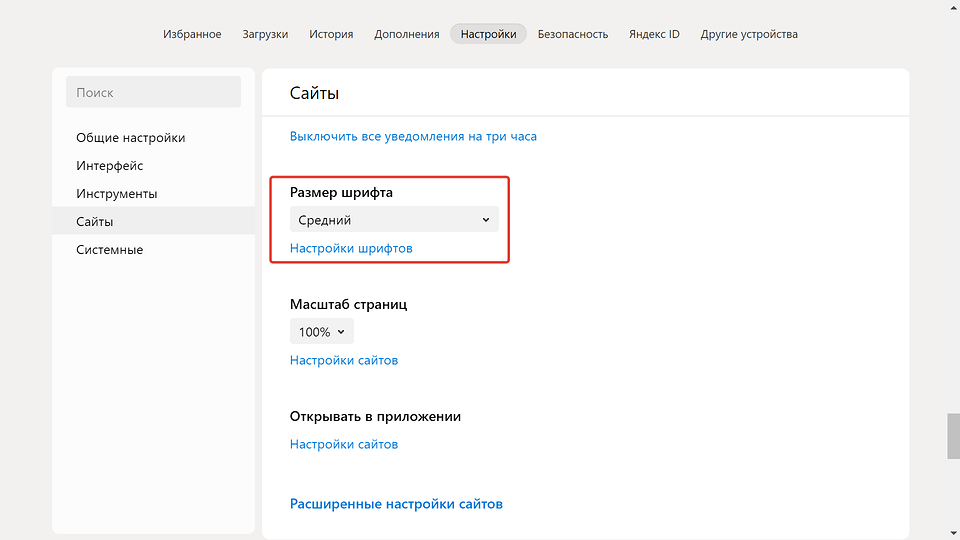Появится меню настройки шрифта и элементов. Там Вы увидите, что есть два варианта настройки размеров — стандартный, который 100%-й размер, он стоит по умолчанию, и средний (увеличенный) имеет 125%-й размер.