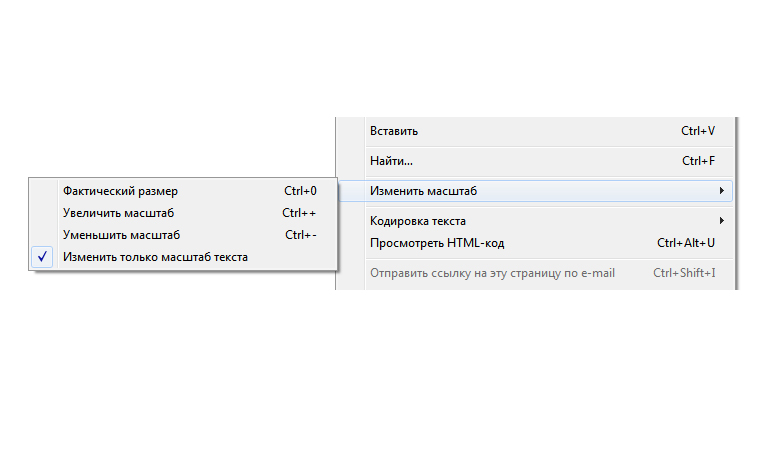 Π ΠΌΠ΅Π½Ρ Β«ΠΡΠΎΡΠΌΠΎΡΡΒ» Π² Π²Π΅ΡΡ Π½Π΅ΠΉ ΡΠ°ΡΡΠΈ ΠΎΠΊΠ½Π° Π±ΡΠ°ΡΠ·Π΅ΡΠ° Π΅ΡΡΡ ΠΏΡΠ½ΠΊΡ Β«ΠΠ°ΡΡΡΠ°Π± ΡΠ΅ΠΊΡΡΠ°Β» Ρ ΠΏΡΠΎΡΠ΅Π½ΡΠ½ΡΠΌ Π·Π½Π°ΡΠ΅Π½ΠΈΠ΅ΠΌ Π² ΡΠΊΠΎΠ±ΠΊΠ°Ρ .Π Π±ΠΎΠ»Π΅Π΅ ΠΏΠΎΠ·Π΄Π½ΠΈΡ Π²Π΅ΡΡΠΈΡΡ ΡΡΠΎΠ³ΠΎ Π±ΡΠ°ΡΠ·Π΅ΡΠ° Π΅ΡΡΡ ΠΎΠΏΡΠΈΡ Zoom Text Only, ΠΊΠΎΡΠΎΡΠ°Ρ ΠΏΠΎΠ·Π²ΠΎΠ»ΡΠ΅Ρ ΠΏΡΠΈΠΌΠ΅Π½ΡΡΡ ΡΠ»Π΅ΠΌΠ΅Π½ΡΡ ΡΠΏΡΠ°Π²Π»Π΅Π½ΠΈΡ ΡΠΎΠ»ΡΠΊΠΎ ΠΊ ΡΠ΅ΠΊΡΡΡ, Π° Π½Π΅ ΠΊ ΠΈΠ·ΠΎΠ±ΡΠ°ΠΆΠ΅Π½ΠΈΡΠΌ. ΠΠΎΠ³Π΄Π° Π²Ρ Π²ΡΠ±ΠΈΡΠ°Π΅ΡΠ΅ ΡΡΠΎΡ ΠΏΡΠ½ΠΊΡ, ΠΎΡΠΊΡΠΎΠ΅ΡΡΡ ΠΏΠΎΠ΄ΠΌΠ΅Π½Ρ, Π² ΠΊΠΎΡΠΎΡΠΎΠΌ Π²Ρ Π½Π°ΠΉΠ΄Π΅ΡΠ΅ ΡΡΠ΄ ΠΏΠΎΠ½ΡΡΠ½ΡΡ Π±Π΅Π· ΠΏΠΎΡΡΠ½Π΅Π½ΠΈΠΉ ΠΎΠΏΡΠΈΠΉ Π΄Π»Ρ ΠΈΠ·ΠΌΠ΅Π½Π΅Π½ΠΈΡ ΡΠ°Π·ΠΌΠ΅ΡΠ° ΡΡΠΈΡΡΠ°. ΠΡΠΎΠΌΠ΅ ΡΠΎΠ³ΠΎ, Π²Ρ ΠΌΠΎΠΆΠ΅ΡΠ΅ ΡΠ΄Π΅ΡΠΆΠΈΠ²Π°ΡΡ ΠΊΠ»Π°Π²ΠΈΡΡ ΠΊΠ»Π°Π²ΠΈΠ°ΡΡΡΡ Ρ Π½Π°Π΄ΠΏΠΈΡΡΡ Β«CtrlΒ» ΠΈ Π½Π°ΠΆΠΈΠΌΠ°ΡΡ ΠΊΠ»Π°Π²ΠΈΡΠΈ Β«+Β» ΠΈΠ»ΠΈ Β«-Β» Π΄Π»Ρ ΡΠ²Π΅Π»ΠΈΡΠ΅Π½ΠΈΡ ΠΈΠ»ΠΈ ΡΠΌΠ΅Π½ΡΡΠ΅Π½ΠΈΡ ΡΠ°Π·ΠΌΠ΅ΡΠ° ΡΡΠΈΡΡΠ° ΡΠΎΠΎΡΠ²Π΅ΡΡΡΠ²Π΅Π½Π½ΠΎ. Π£Π²Π΅Π»ΠΈΡΠ΅Π½ΠΈΠ΅ ΡΠ°Π·ΠΌΠ΅ΡΠ° ΡΡΠΈΡΡΠ° ΡΠ΄Π΅Π»Π°Π΅Ρ ΡΠ΅ΠΊΡΡ Π½Π° Π²Π΅Π±-ΡΡΡΠ°Π½ΠΈΡΠ΅ Π±ΠΎΠ»ΡΡΠ΅ (ΠΈ, Π²ΠΎΠ·ΠΌΠΎΠΆΠ½ΠΎ, Π΅Π³ΠΎ Π±ΡΠ΄Π΅Ρ Π»Π΅Π³ΡΠ΅ ΡΠΈΡΠ°ΡΡ), Π° ΡΠΌΠ΅Π½ΡΡΠ΅Π½ΠΈΠ΅ ΡΠ°Π·ΠΌΠ΅ΡΠ° ΡΡΠΈΡΡΠ° ΡΠ΄Π΅Π»Π°Π΅Ρ ΡΠ΅ΠΊΡΡ ΠΌΠ΅Π½ΡΡΠ΅, ΡΡΠΎ ΠΏΠΎΠ·Π²ΠΎΠ»ΠΈΡ Π²Π°ΠΌ Π²ΠΈΠ΄Π΅ΡΡ Π±ΠΎΠ»ΡΡΠ΅ Π²Π΅Π±-ΡΡΡΠ°Π½ΠΈΡΡ Π±Π΅Π· ΠΏΡΠΎΠΊΡΡΡΠΊΠΈ.