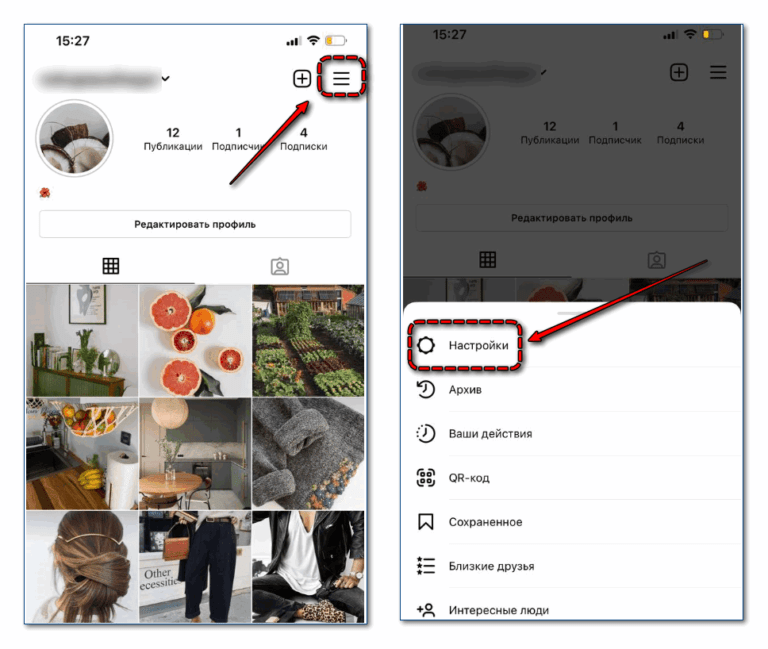 - Переходят в профиль. Тапают на 3 горизонтальных строчки в правом верхнем углу экрана.