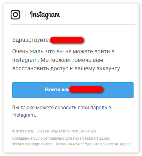 Теперь зайдите на почту — через компьютер или телефон. Откройте письмо, которое пришло от Instagram. Нажмите кнопку «Войти как @ваш_логин».