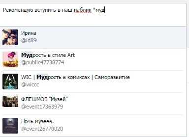 Такой метод работает только для тех групп и людей, в которые вы вступили или с кем дружите. Тогда просто нажмите * и без пробела начинайте вводить имя или название сообщества/мероприятия. Появится список, из которого вы сможете мышкой выбрать нужный вариант.