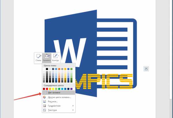 Если хотите убрать белый фон под текстом, то вам нужно установить курсор в рамку с текстом и перейти на вкладку «Формат». Здесь нужно нажать на кнопку «Заливка фигуры» и выбрать вариант «Нет заливки».