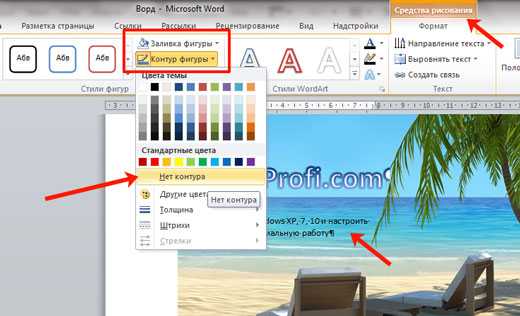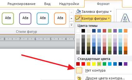 Похожим способом можно убрать и контур вокруг текста. Для этого нужно нажать на кнопку «Контур фигуры» на вкладке «Формат» и выбрать вариант «Нет контура».