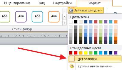 Если Вам не подходит белый фон прямоугольника и наличие границ, выберите«Средства рисования» – «Формат». Нажмите на кнопки «Заливка фигуры» и «Контур фигуры», затем кликайте из списка «Нет заливки», «Нет контура» – соответственно.