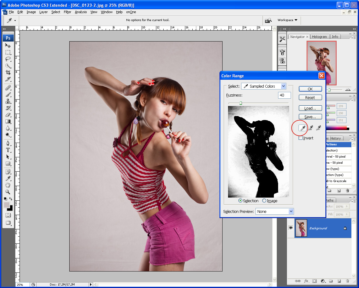 Так мы указали фотошопу наше отправное значение диапазона цвета. Дальнейшие шаги — это увеличение/уменьшение необходимых цветов, которые программа должна в итоге выделить.