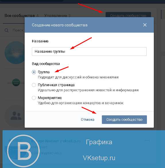 В социальной сети вконтакте, есть несколько типов сообществ. Самое распространенное — это группа. Такой тип сообщества подходит для объединения аудитории, публикации тематических материалов и т.д.
