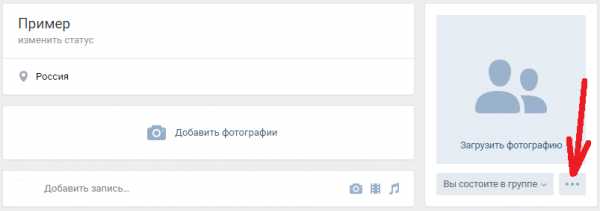 - Зайти на страницу своей группы и нажать на кнопку с 3 точками под аватаркой сообщества, как показано на картинке