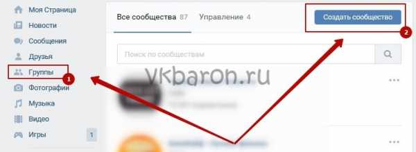 - Для начала создаём сообщество (Мои группы —> Создать сообщество —> Группа (ввести название) —> Создать сообщество).