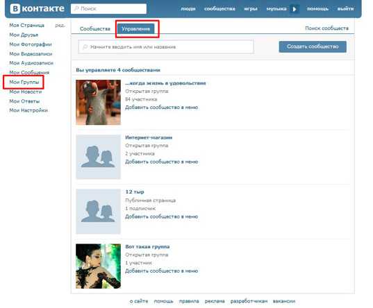 Закрыть группу, если она уже создана, а вы являетесь ее администратором, вообще не проблематично. Открываете свою страничку, переходите в раздел «Мои группы», а затем во вкладку «Управление». Открываете нужный паблик.