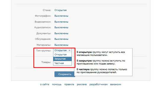 Здесь уже знакомый нам раздел. В пункте «Тип группы», выбираем «Закрытая». Сохраняем настройки.