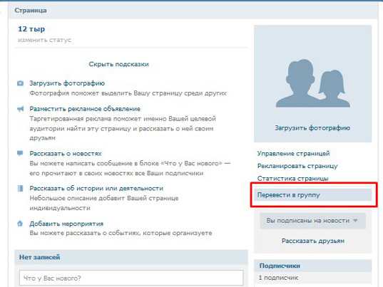 Если вы полновластный владелец, то на главной странице, под картинкой, у вас будет сиять предложение: «Перевести в группу».