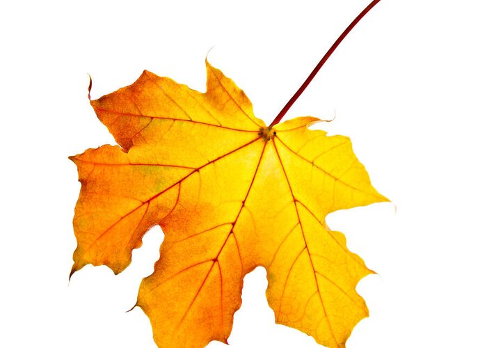 Нежная срисовка осеннего кленового листа в желто-оранжевых тонах на зеленом расплывчатом фоне.