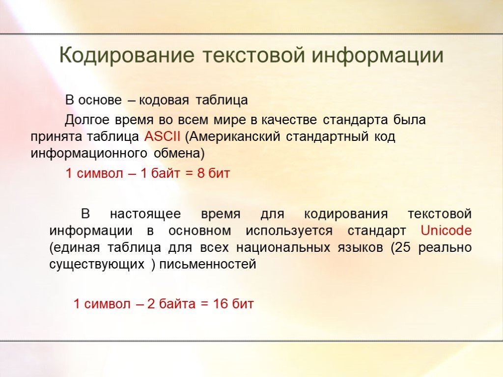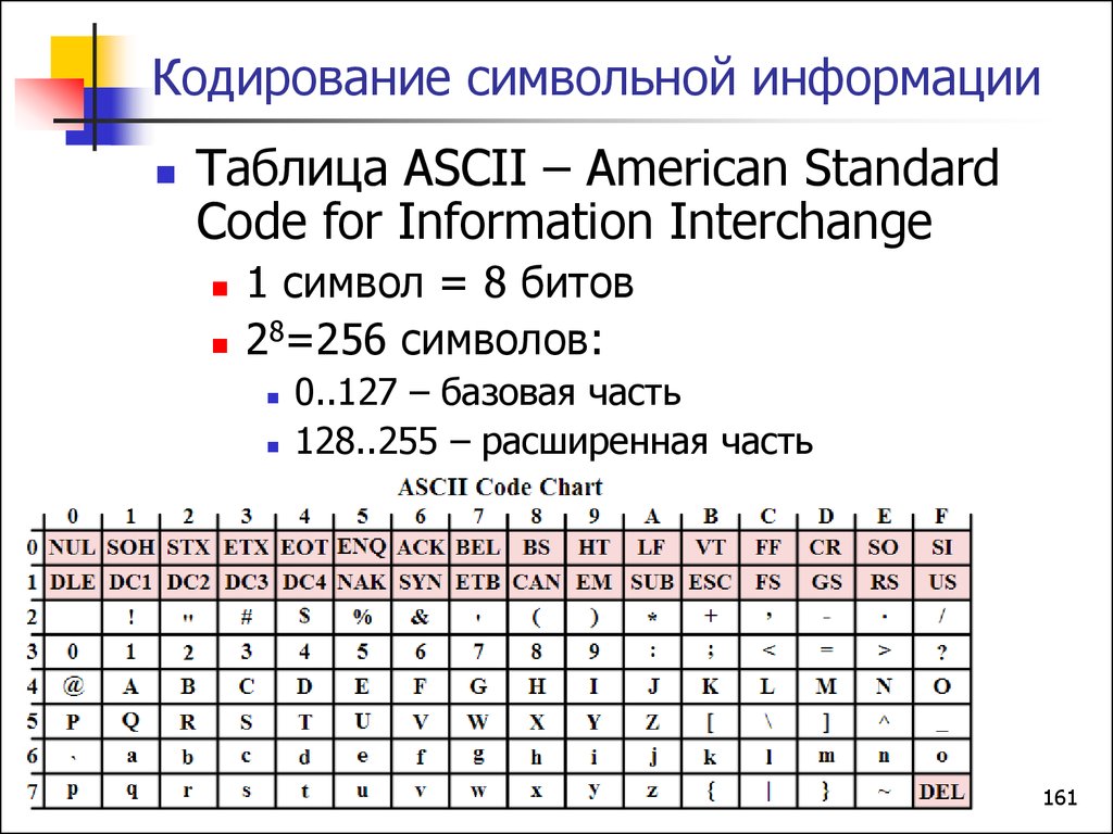 При разработке программного обеспечения ПК был создан 8-битный стандарт кодировки текстов, что дало возможность увеличить диапазон кодирования информации до 256 символов. При этом первые 128 символов соответствуют стандартам ASCII, а остальная половина имеет свои специфику, связанную с языковыми региональными особенностями.