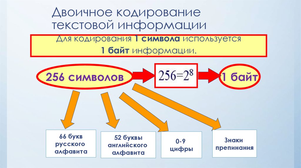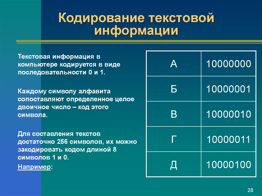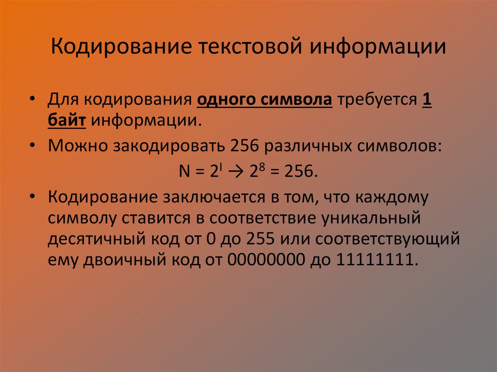 В компьютерной технике текстовое кодирование информации и ее хранение осуществляется с использованием двоичного кода. Для этого каждому символу присваивается определенное неотрицательное число, или код символа, которое записывается в память вычислительной аппаратуры с помощью двоичного кода.