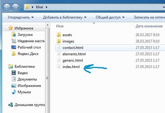 Когда скачаете — откройте папку «blue» и внутри вы найдете несколько файлов с расширением html. Кликните два раза на тот, который называется index.html.