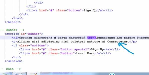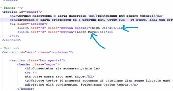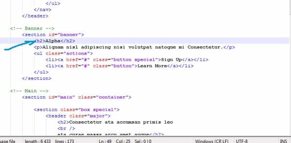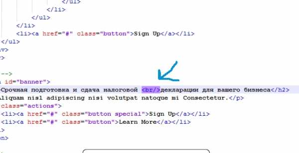 Сначала поменяем заголовок. Вместо «Alpha» напишем что-нибудь по нашей теме. Напоминаю, что тут мы продаем юридические услуги. Значит можно сформулировать это примерно так: «Срочная подготовка и сдача налоговой декларации для вашего бизнеса». Вставляем этот текст вот сюда, между тегами <h3></h3>: