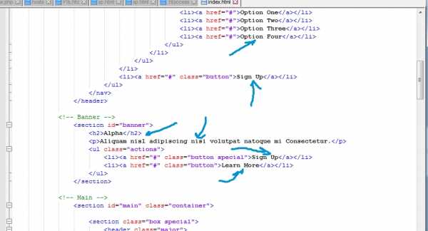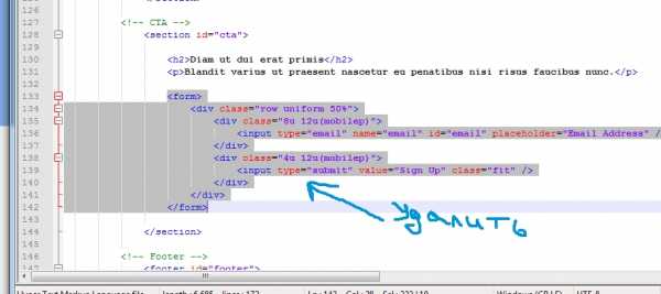 Перед вами откроется исходный код нашего шаблона, во всей его красе. Если вы раньше не имели дела с html, то вас этот вид может немного напугать — много циферок, буковок и непонятных значков. Но ничего страшного тут на самом деле нет. Нам надо просто заменять текст, который написан черным цветом.
