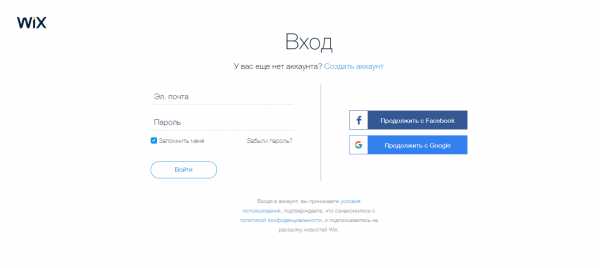 Жмем «Создать сайт». Появляется форма регистрации, которую можно быстро пройти, благодаря аккаунтам Facebook или Google.
