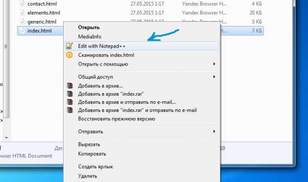 Кликайте правой кнопкой мыши по файлу «index.html» и выбирайте «Открыть с помощью — Notepad++».