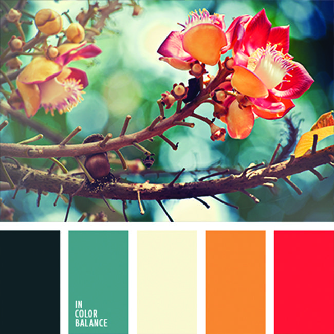 Сочетание алого, светло-оливкового, светло-бирюзового цветов