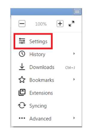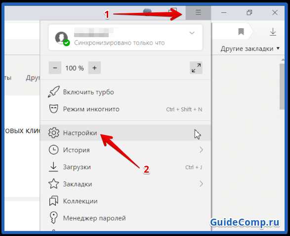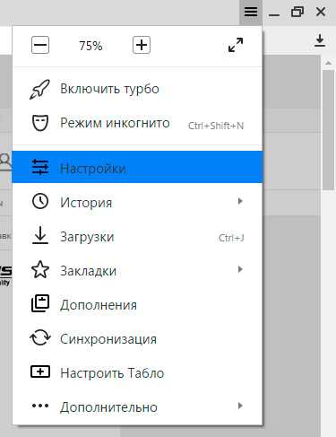 - Пункт «Настройки» для изменения настроек обозревателя.