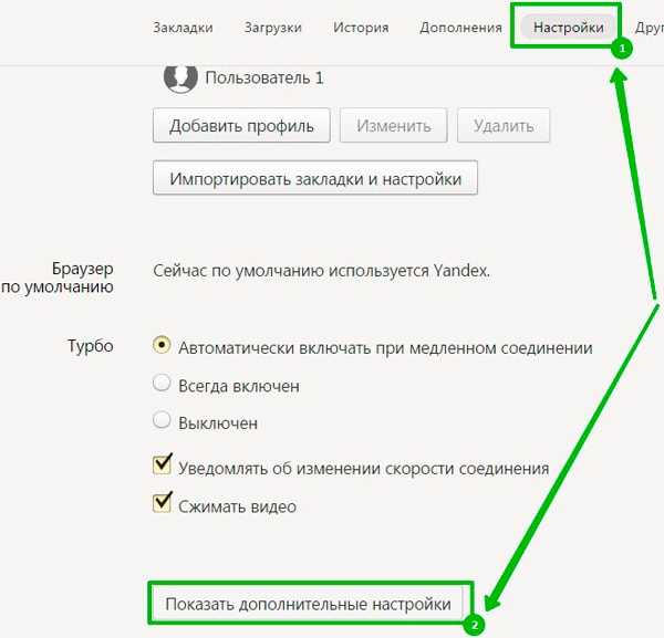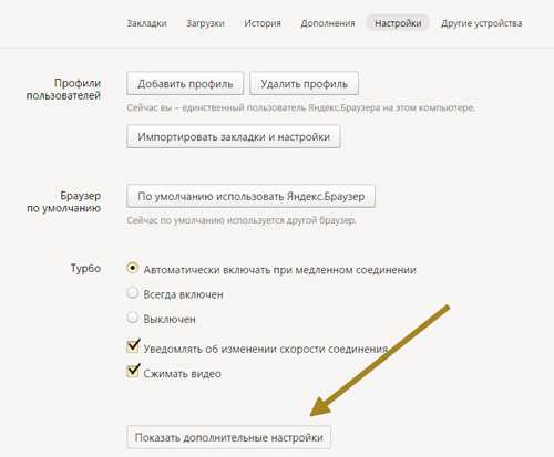 Пункт меню «Настройки» (3) открывает возможность изменить установки браузера «по умолчанию». На главной странице, в самом низу окна, настроек найдите и кликните «Показать дополнительные настройки»:
