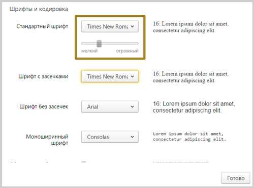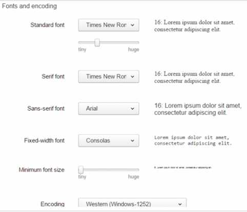Сейчас, все тексты у вас отображаются исходя из этих настроек. Стандартные шрифты – Times New Roman, он же идет как шрифт с насечками, без них высвечивается Arial и Consolas, как моноширинный. Под основным, стандартным шрифтом есть ползунок, благодаря которому вы можете изменить размер текста.