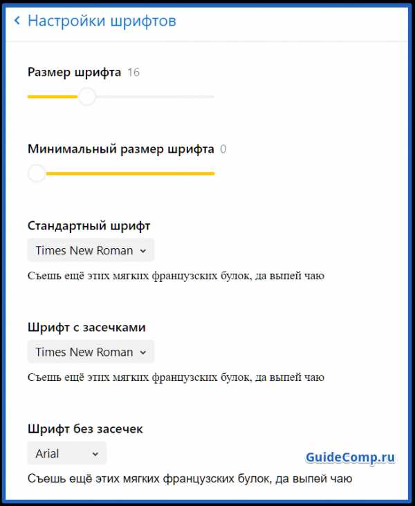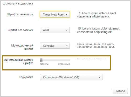 - Минимальный размер шрифта (Minimum size) в этом пункте можно увеличить текст в Яндексе написанный маленьким шрифтом установив с помощью ползунка каким он должен отображаться.