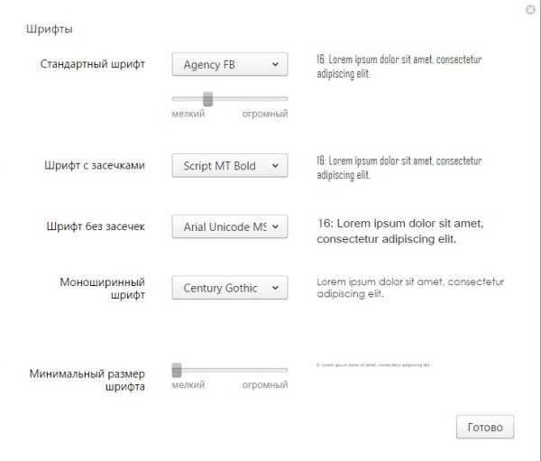 Ниже пользователь может изменить вид шрифта. В браузере представлено 4 варианта, под каждым из которых выводится пример того, как он будет выглядеть на страницах сайтов.