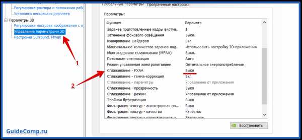 - На вкладке «Глобальные настройки» выбираем «Сглаживание – FXAA» и указываем «Выключить».