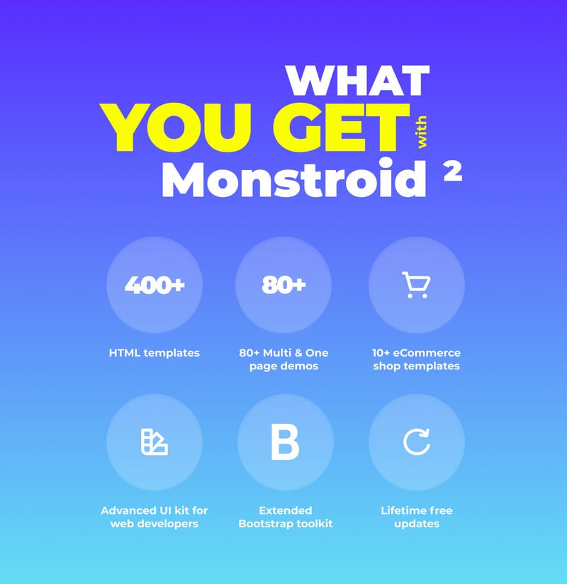 Monstroid 2 универсален, он идеально подойдет для создания сайта любого типа, начиная от магазина аксессуаров и заканчивая фитнесс клубом. В комплекте идет 10 различных дизайнов, предназначенных для разнообразных отраслей.