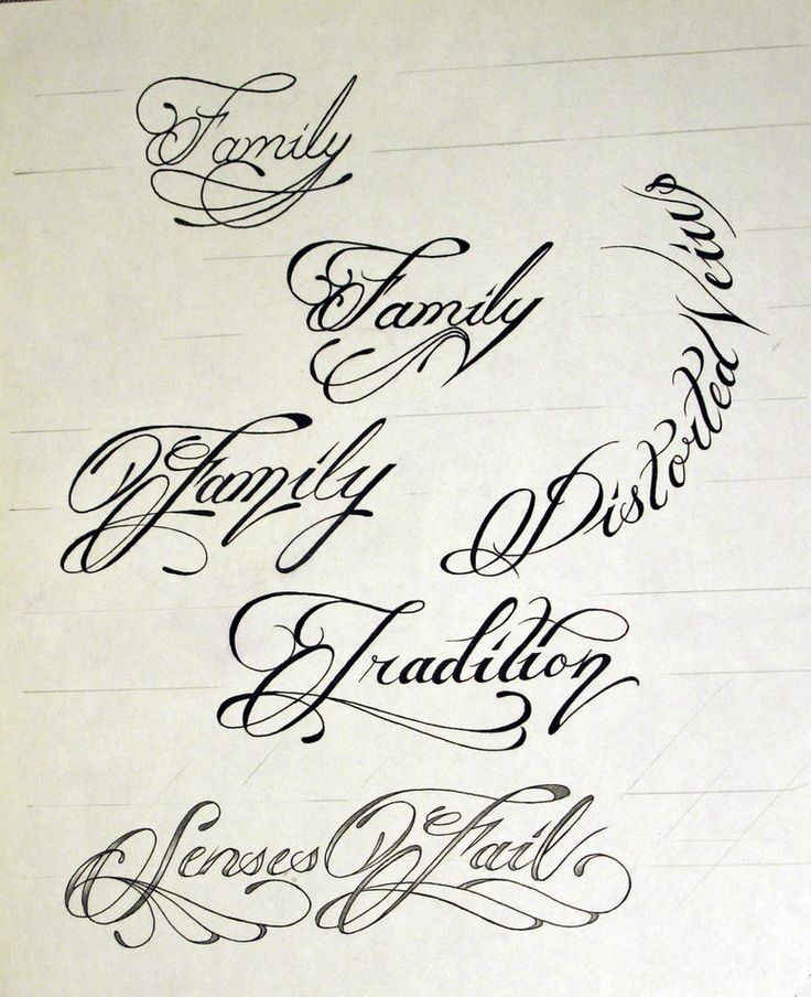 Этот шрифт выбран по многим причинам. Он максимально разборчив и понятен, вы легко сможете подобрать наиболее подходящие к стилю буквы и знаки для своей татуировки. Каллиграфический шрифт может быть классическим, что сделает вашу татуировку похожей на старинную надпись, а также простым, в котором используются обычные буквы, написанные от руки.