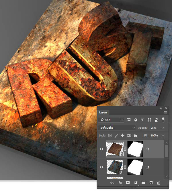 Изображение выглядит интересно, но оно немного затенённое. Давайте попробуем применить какой-нибудь другой интересный режим наложения. Поменяйте режим наложения для слоя с текстурой на Мягкий свет (Soft Light).